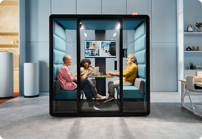 Permite la participación en reuniones de hasta 4 personas en condiciones acústicas confortables. Las reuniones formales e informales, el trabajo creativo y las videoconferencias con varias personas se han vuelto más efectivas. La cabina de reuniones HushFree.M es el espacio perfecto para el trabajo en equipo y las reuniones más formales donde se requiere silencio y privacidad en las conversaciones.